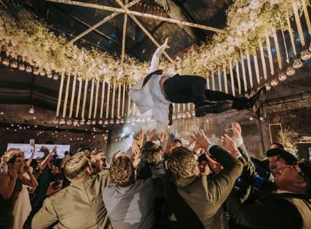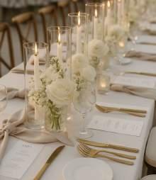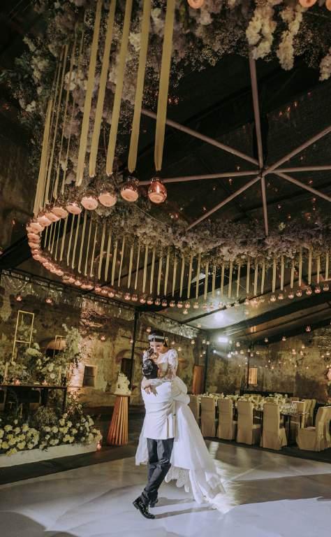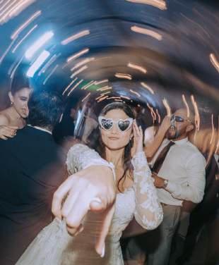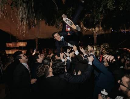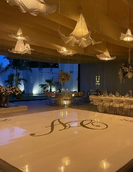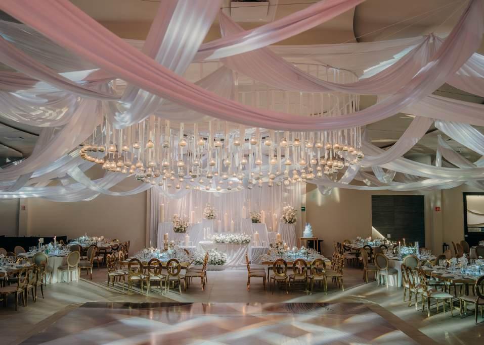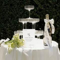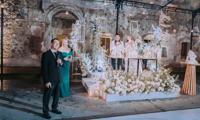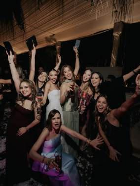 La celebración se convierte en una experiencia sensorial completa. Torres de champagne, gastronomía presentada como pieza visual y una iluminación cálida que envuelve cada detalle refuerzan la idea de una boda pensada para ser vivida y observada. Cada elemento tiene un propósito estético y emocional.