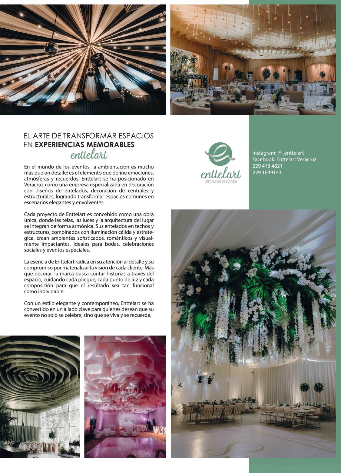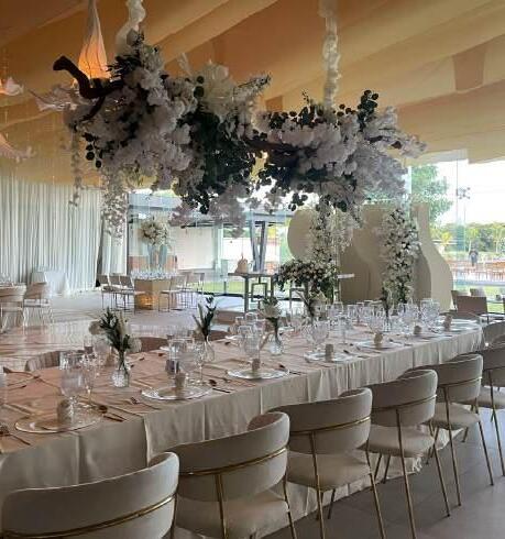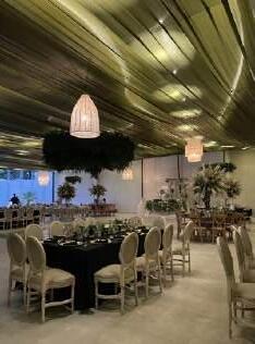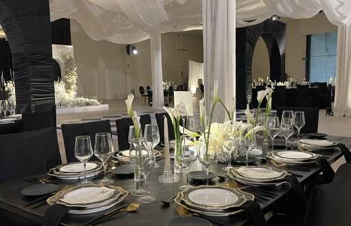 Los espacios se diseñan desde el movimiento. Telas oscuras suspendidas crean dramatismo aéreo, mesas de trazo curvo rompen con la rigidez tradicional y los arreglos florales se presentan deconstruidos, libres, con texturas naturales que celebran la imperfección como lujo. La estética es refinada, pero nunca rígida.