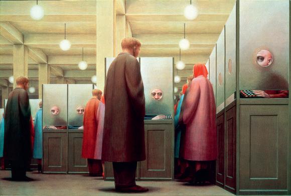 Oficina del gobierno, George Tooker, 1956, temple al huevo sobre plancha con imprimación de gesso, 49,8 × 75,2 cm, Metropolitan Museum of Art, Nueva York, Estados Unidos