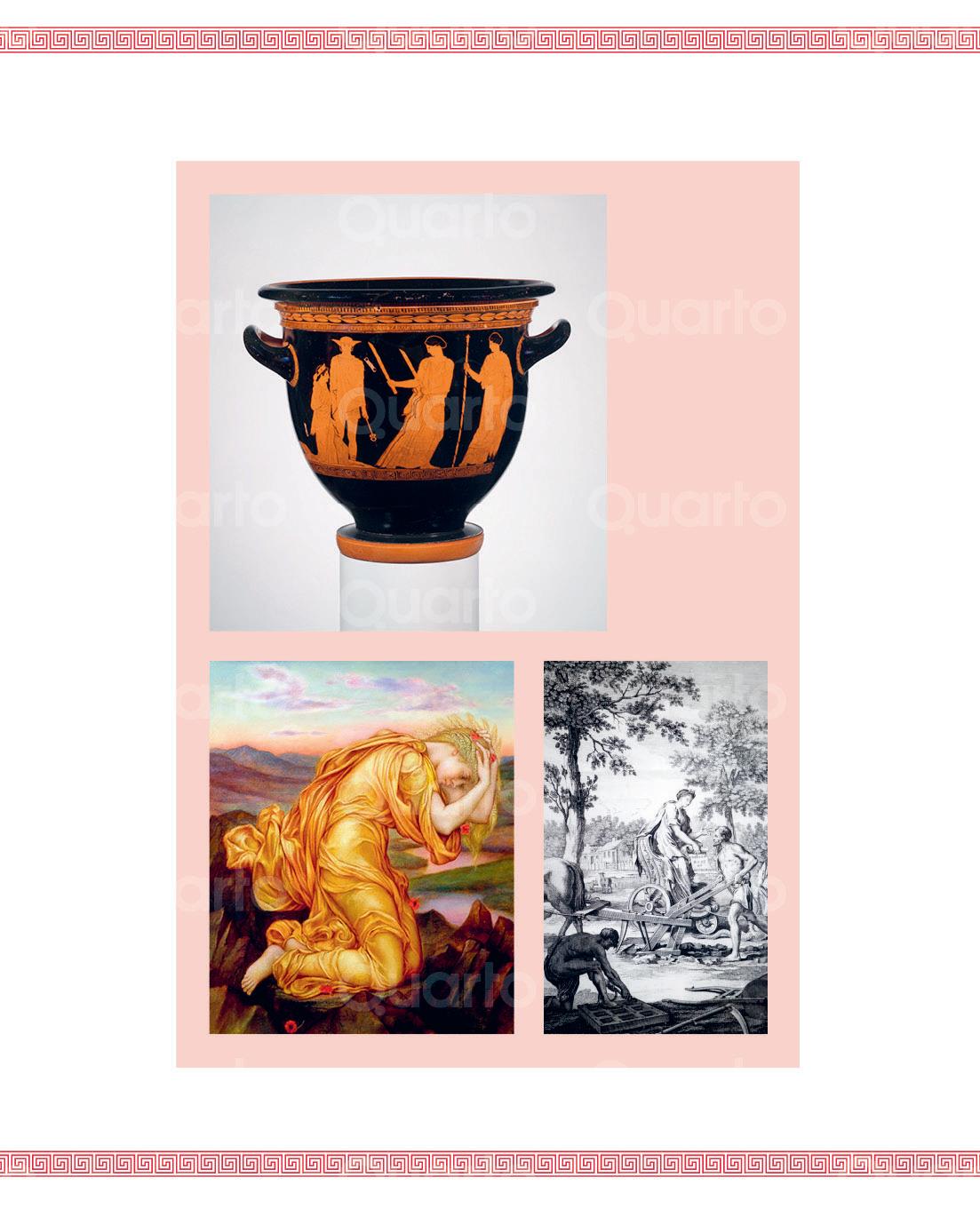 Inferior derecha: en A Compleat Body of Husbandry, de Thomas Hale («Tratado de agricultura», 1756), Deméter muestra a un agricultor un pergamino con el título del libro.