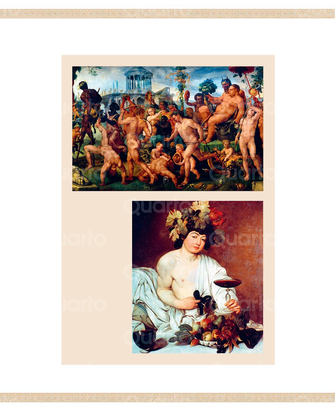 Derecha: si Dioniso está implicado, suele haber sorpresas. En Baco (h. 1595), Caravaggio lo retrata ofreciendo una copa de vino, pero la granada abierta y la manzana podrida del frutero recuerdan que la fermentación tiene su reverso: la decadencia.