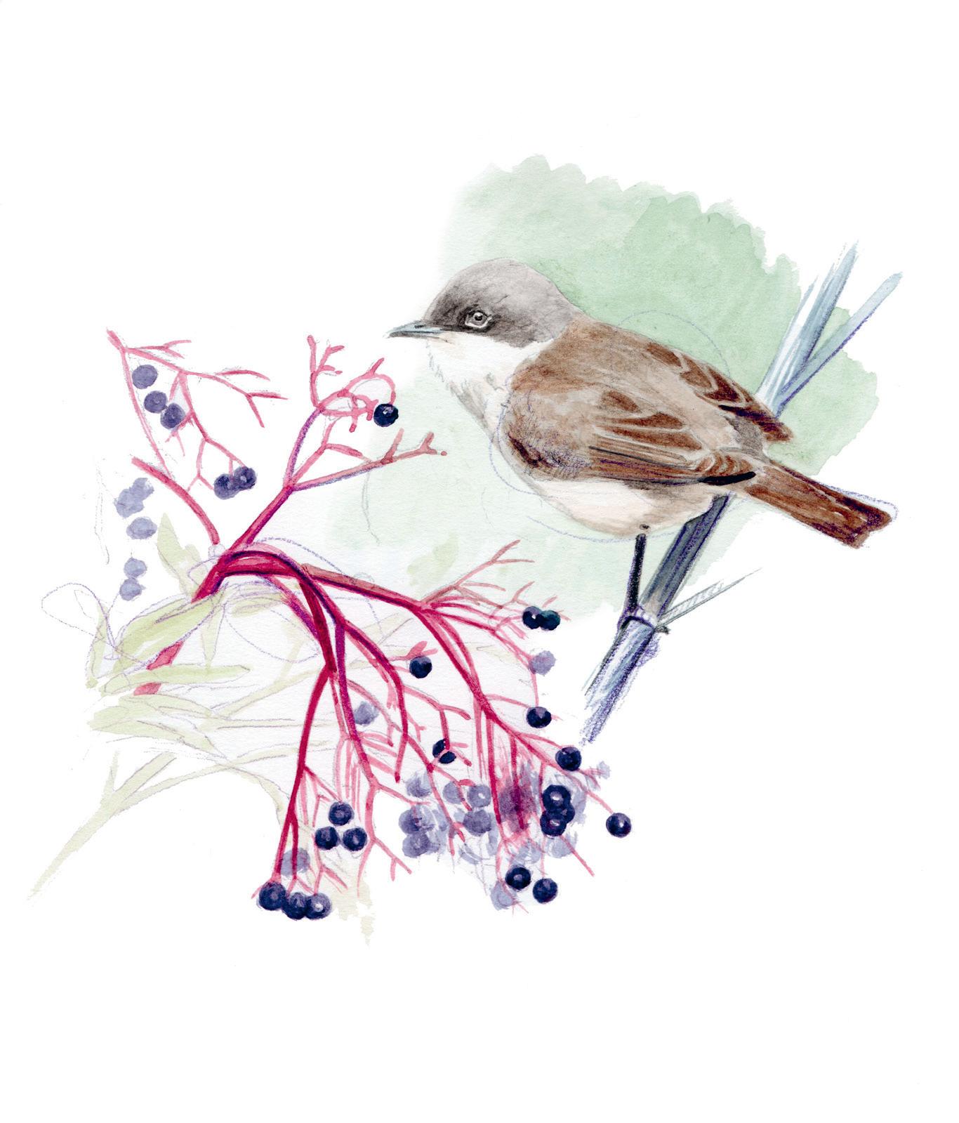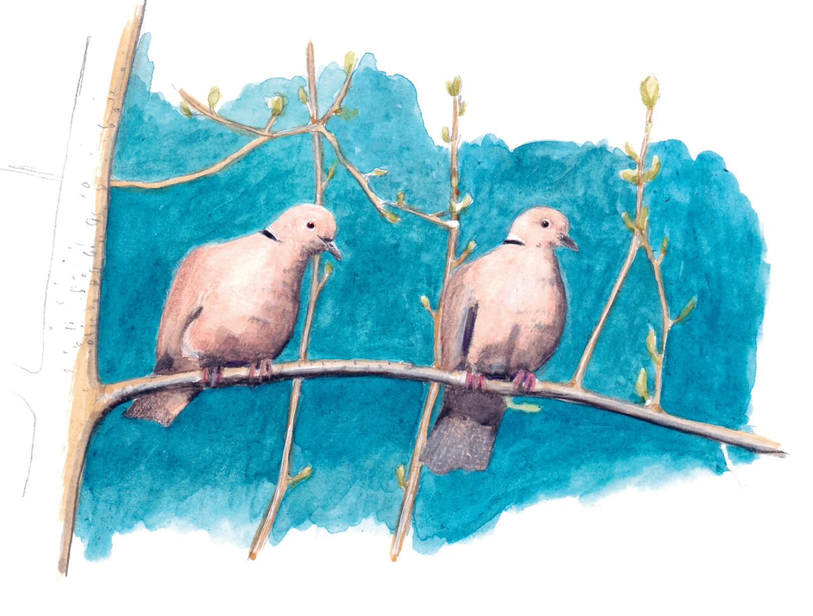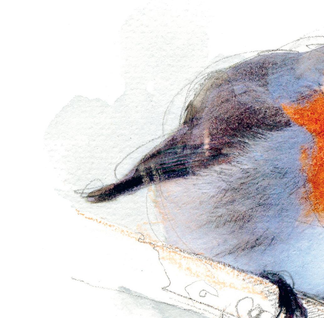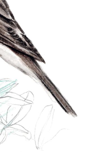 Desde que tengo memoria, siempre me he tomado tiempo para observar lo que me rodea. Crecí en Normandía, en el Eure, en un entorno natural rico y bien conservado. Disfrutaba cuidando del jardín con mis padres en esa tierra fértil donde todo parece crecer. Fue un tiempo liberador para mí. Desde muy joven sentí atracción por el dibujo. Paralelamente a mis estudios en la Escuela de Bellas Artes de Le Havre, trabajaba en reservas naturales, rodeada de científicos, de quienes lo aprendí todo. Dibujaba el comportamiento animal dentro de su entorno, a menudo vegetal. Esas horas de inmersión en lo salvaje me permitieron representarlos con la mayor fidelidad posible. Muy pronto comprendí que, para poder representar a unos (aves, insectos, mamíferos…), era necesario entender a los otros (el bosque, el campo, la flora…). Lo vegetal es hogar, planta huésped, refugio y alimento. Es un todo, un conjunto, y nosotros formamos parte de ese conjunto esencial. Démosle el lugar que merece, para que la abundancia regrese. He reunido aquí mis dibujos sobre el mundo alado, esbozados al hilo de los caminos y las estaciones.