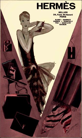 IZQUIERDA Antiguo anuncio de Hermès de la década de 1920 en el que vemos a una emblemática joven de la época rodeada de sus accesorios Hermès, entre los que se encuentran el bolso, el pañuelo y el espejo de tocador.