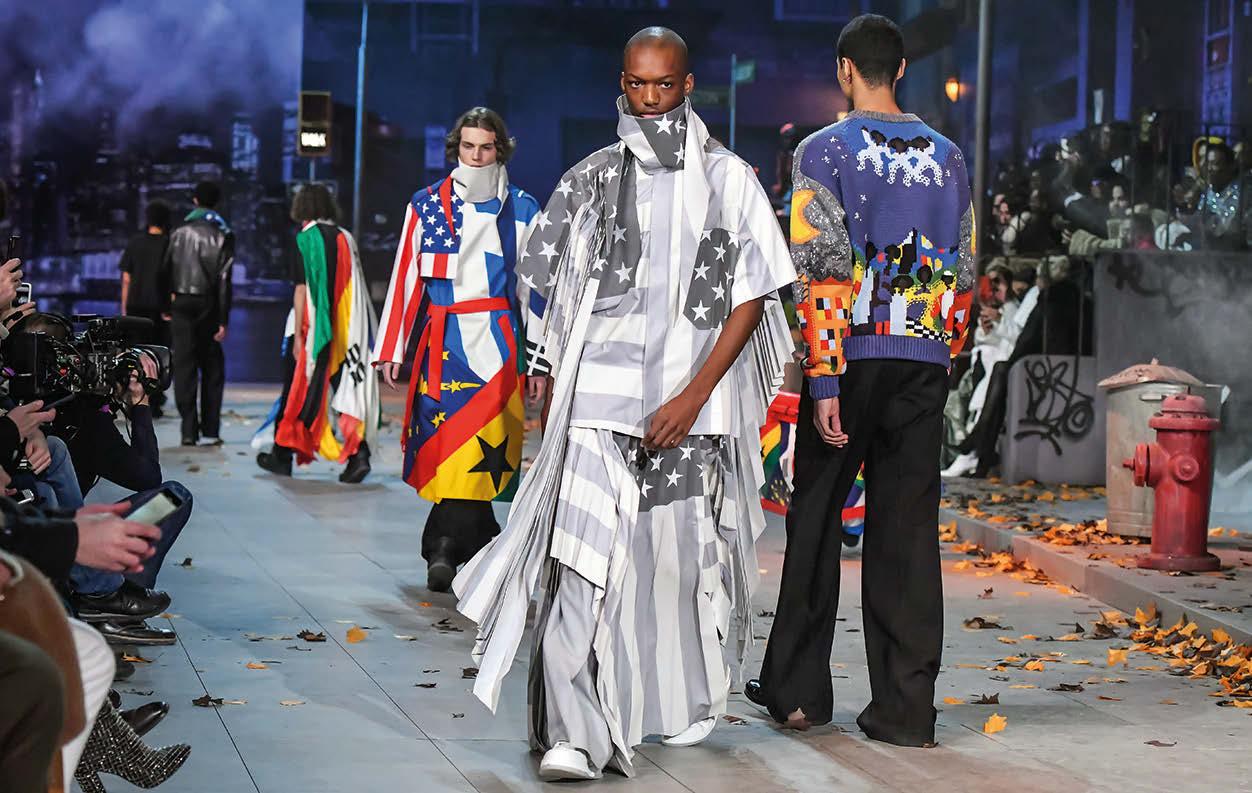 INFERIOR Para el otoño / invierno de 2019, Abloh rindió homenaje no solo al legado de Louis Vuitton relacionado con los viajes, sino también a sí mismo, con atuendos que incluyeron banderas africanas y las barras y estrellas estadounidenses.