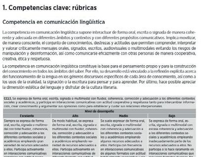 Cada unidad didáctica se acompaña de dos documentos: la programación de aula con las competencias específicas de cada sesión con su conexión con los descriptores del perfil de salida, y las rúbricas de las competencias específicas asociadas a las evidencias abordadas en la unidad.