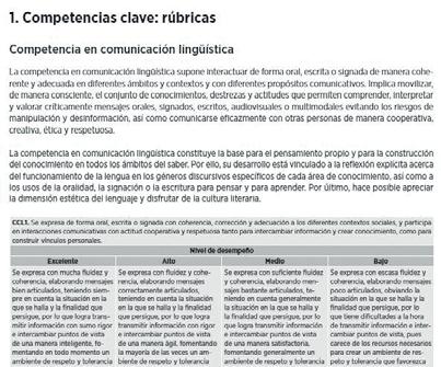 cada unidad didáctica se acompaña de dos documentos: la programación de aula con las competencias específicas de cada sesión con su conexión con los descriptores del perfil de salida, y las rúbricas de las competencias específicas asociadas a las evidencias abordadas en la unidad.