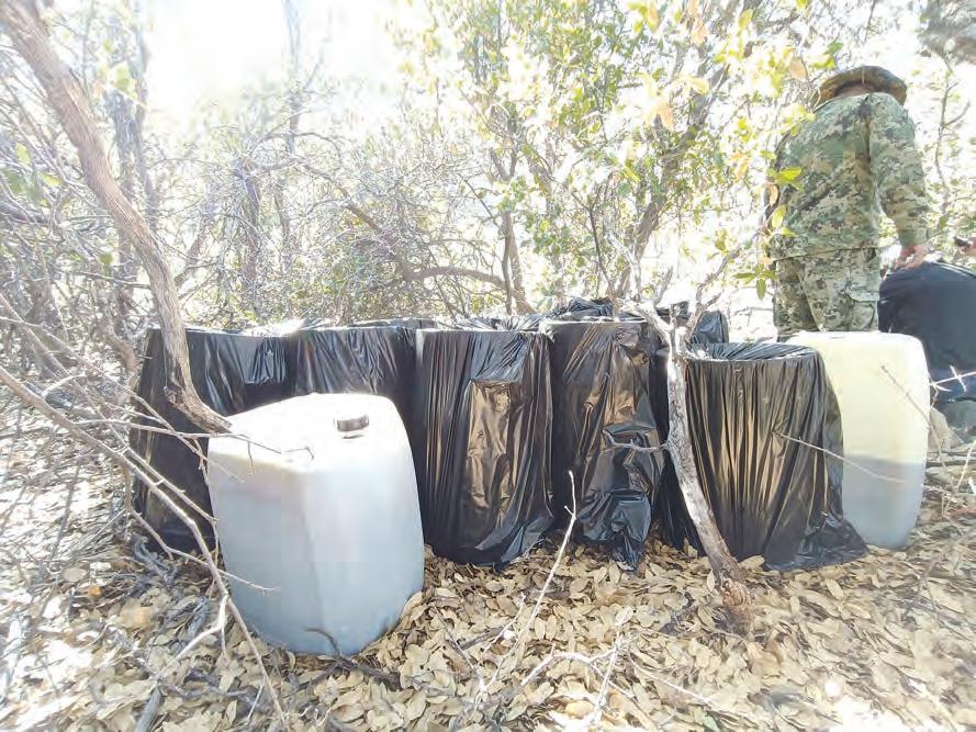 precursores químicos y producir entre 30 y 40 kilogramos de droga sintética por semana. Asimismo, se decomisaron 10 bidones de plástico blanco, con capacidad de 60 litros cada uno, que contenían un líquido aceitoso amarillo oscuro, presuntamente un compuesto químico listo para ser procesado hasta convertirse en metanfetamina. En uno de los extremos del complejo ilegal se localizó un pozo de agua cristalina, de dimensiones medianas, perforado por los operadores del laboratorio para abastecer la producción. También se halló un hoyo en la arena utilizado para la disposición de desechos tóxicos, identificado como un charco oscuro de considerable profundidad, cuyo contenido contaminado se filtra-