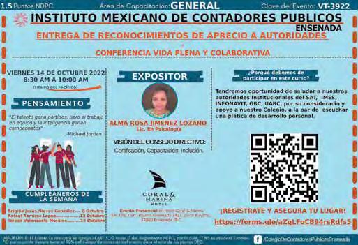 Y Manuel Alejandro Mendoza Jimé nez, dará una plática sobre “Fracturas ex puestas”, a las 12:00 horas. El viernes 14 participará María Irene Romero Valdez con “CaCu prevención y detección opor tuna”, 09:00.