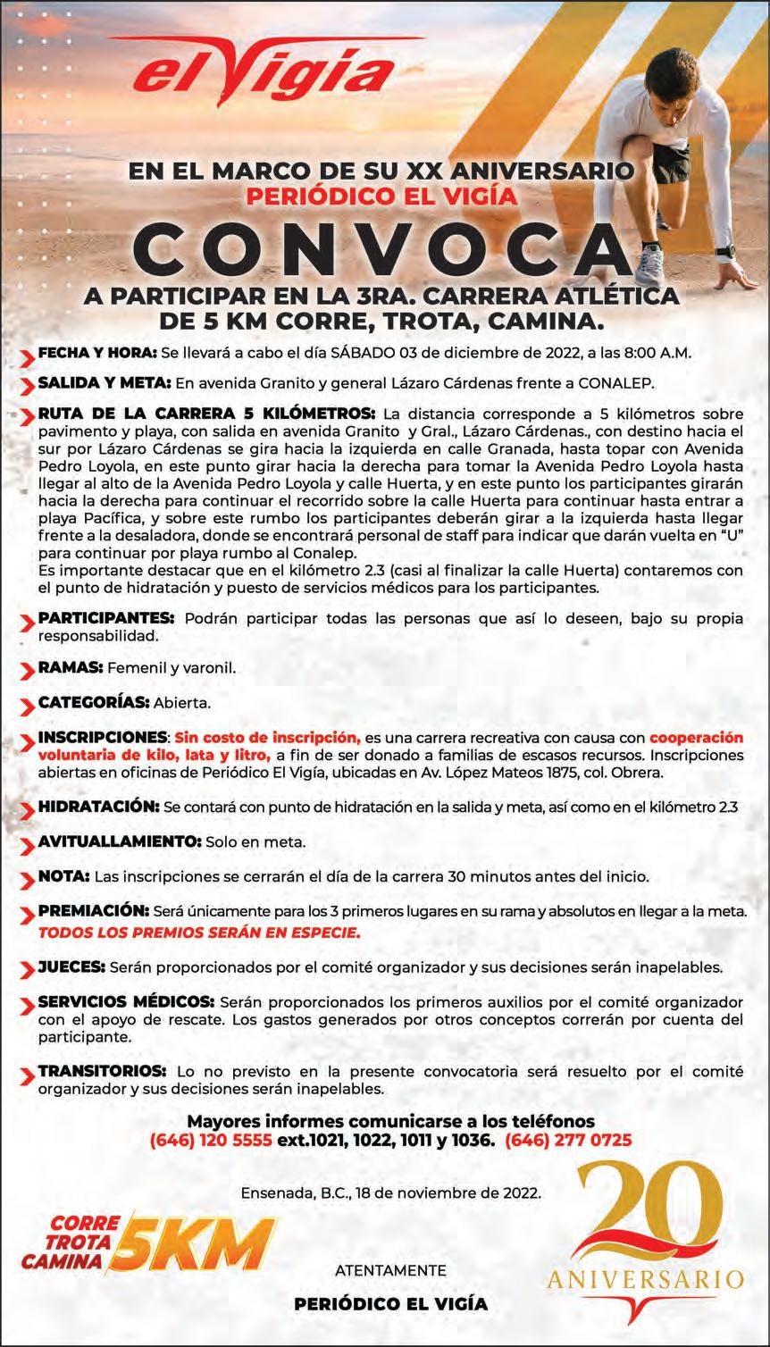 Periódico el Vigía invita a la comunidad en ge neral a participar en su tradicional carrera atlética re creativa “Corre, Trota, Cami na 5k”. La casa editora celebra sus 20 años de ‘Periodismo con la gente’ y lo festeja de portivamente el próximo sá bado 3 de diciembre en punto de las 8:00 de la mañana. En esta ocasión, la salida y meta será frente a las instalaciones de Conalep.