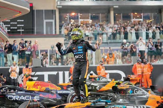Después del último error en Qatar, McLaren ahora si apostó por una estrategia diferente al mandar a Norris con neumáticos medios y a Piastri con duros. George Russell y Charles Leclerc se convirtieron en aliados temporales de Verstappen. El piloto de Mercedes intentó presionar a los McLaren en la arrancada pero su reacción fue lenta y perdió dos posiciones. Al quedar detrás del Aston Martin de Fernando Alonso y el Ferrari de Charles Leclerc, al británico no tuvo otra opción que remontar y perdió tiempo. Leclerc se acercó a Norris, que ya había perdido la segunda plaza ante su compañero Piastri, y lo atacó sin contemplaciones para quitarle ese tercer puesto. McLaren, con todos sus errores en el año, sacó adelante la misión y por primera vez desde 2008, que se coronaron con Lewis Hamilton, recuperaron el título.