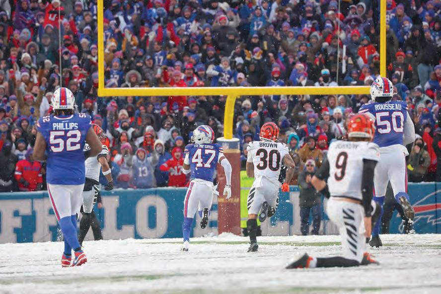 de 36 como la más larga por un quarterback de los Bills, y Buffalo cambió el juego con grandes jugadas defensivas en una tarde nevada en el oeste de Nueva York. Benford y el ala defensiva A.J. Epenesa interceptaron a Joe Burrow en jugadas consecutivas, lo que llevó a los Bills a anotar tres touchdowns en un lapso de 4:20 en el cuarto período. La intercepción de Benford —el defensivo saltó para atrapar el pase de Burrow destinado a Ja’Marr Chase— le dio a Buffalo su primera ventaja con 5:25 restantes.