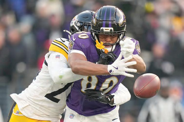 manos en la zona de anotación, y ambos pies tocaron el suelo, pero cuando estaba a punto de completar otro paso con su pie derecho, Joey Porter Jr. de los Steelers le soltó el balón. Inicialmente se marcó como touchdown, pero luego se cambió a pase incompleto. Los Cuervos finalmente perdieron el balón en downs.