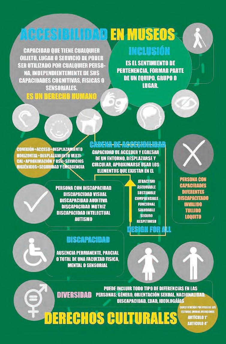 cesibilidad, se sustenta en el derecho humano del acceso, uso y disfrute del espacio de manera inclusiva, sobre todo en los de función pública, como lo son, parques, plazas, escuelas, transporte y por supuesto, museos.