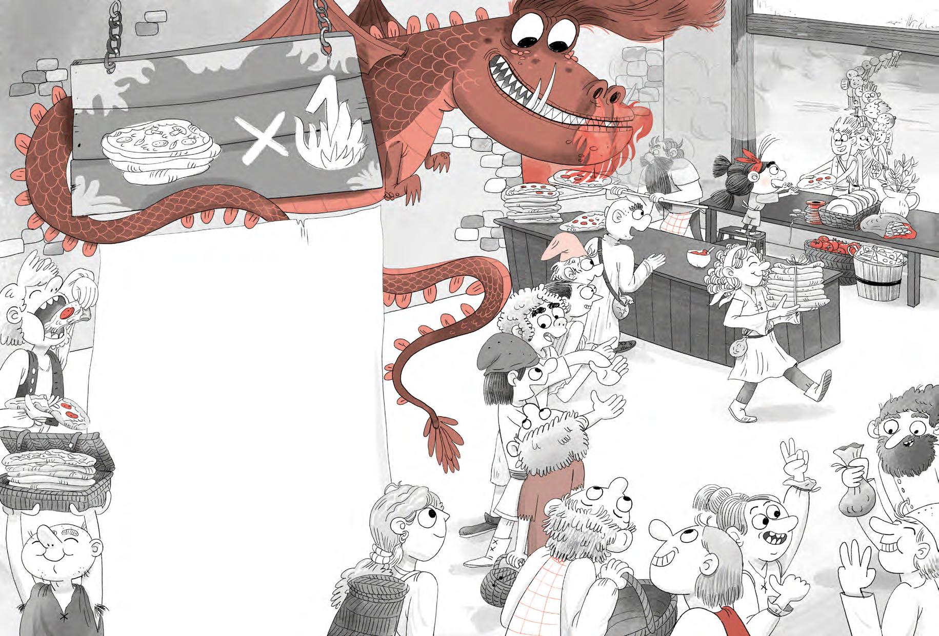—No és que m’avorreixi... —va confessar el drac—, però preferiria estar-me aquí endrapant pizza com aquests ganduls en lloc de repartir-la perquè se la mengin els altres. Perquè al final, tu i jo som sempre els últims de sopar i només ens queden les restes fredes...