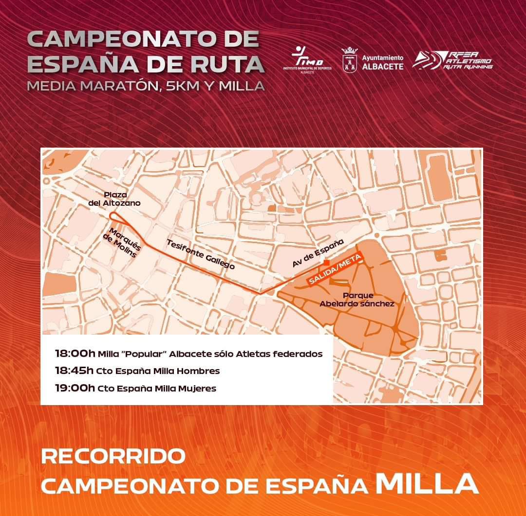 La Real Federación Española de Atletismo, en colaboración con la Federación de Atletismo de Castilla la Mancha y el Ayuntamiento de Albacete, organiza los días 5 y 6 de octubre el Campeonato de España de Ruta, que reúne en un fin de semana el XIII Campeonato de España de Milla en Ruta Absoluto, el III Campeonato de España de 5 km en Ruta Absoluto así como el XXXIII Campeonato de España de Medio Maratón (Absoluto y Master) y que se disputa conjuntamente con el 27º Medio Maratón de Albacete.