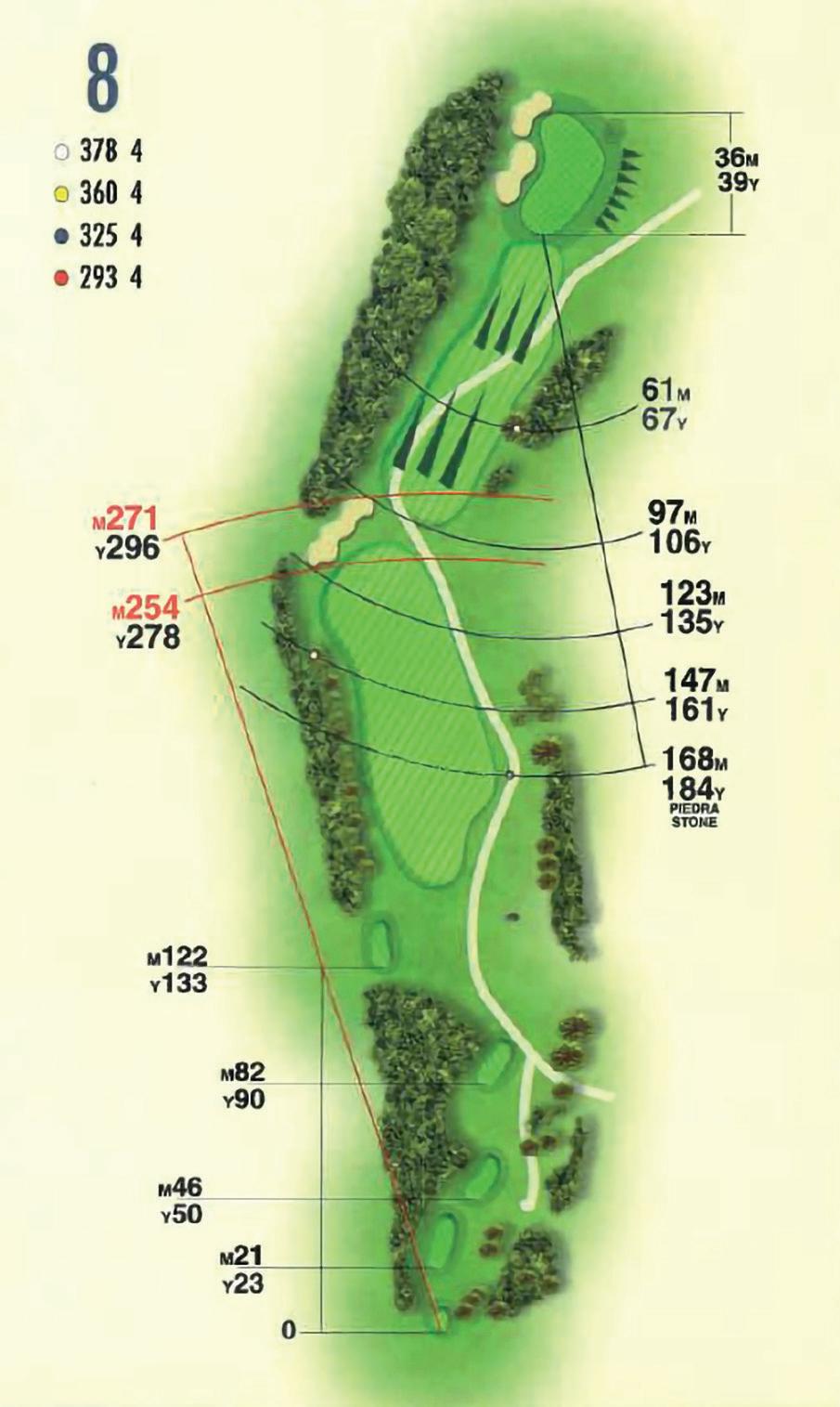 HOYO 8 (par 4)–Buscar siempre la zona derecha. Es mejor no hacer mucha distancia con el primer golpe y dejar el segundo golpe para un hierro medio-corto. Asegurar el golpe a green por la derecha del mismo.