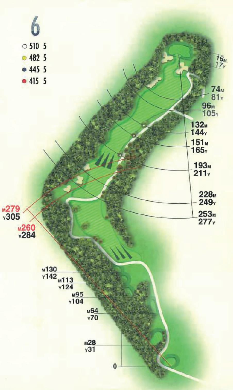 HOYO 6 (par 5)–El pegador puede intentar acortar por la derecha, aunque lo seguro es apuntar al bunker del centro. El segundo golpe debe buscar la derecha de la calle para atacar un green bien protegido frontalmente.