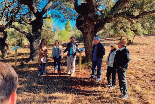 La jornada empezó con una visita a la finca «Bonilla», en Torres de Albanchez, dedicada a la producción ecológica, olivar fundamentalmente, con aceitunas de las variedades: picha y Royal de Cazorla, y plantaciones de pistachos y Nogales y frutales, cereal ecológico y el pasto ecológico cuidado por 400 ovejas de raza segureña autóctona. Estos días se recogía azafrán silvestre, para extraer sus pistilos rojos tan delicados y excelsos para condimentar diferentes guisos y platos de la gastronomía local. En la finca, los participantes recorrieron el bosque poético descubriendo las placas y los poemas de los dos ganadores y los dos accésits, y de los miembros del jurado, situados delante de magníficos ejemplares de encinas centenarias, algunas de 300 y más años, donde los autores leyeron sus respectivos poemas, ante el silencio del bosque y la sombra de las copas y las ramas de las encinas que agradecían la presencia, bajo sus hojas de aquella delegación humana amante de la poesía.