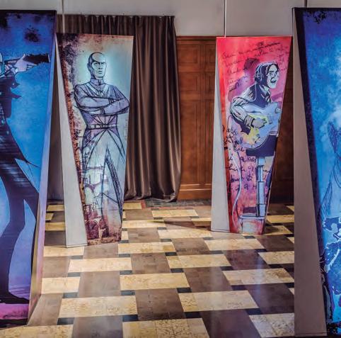 SALA 4. (Años 60 y 70) En esta zona se observa una visión panorámica de los personajes que vivían en la casa, que fue fuente de inspiración o que pasaron alguna temporada. En el salón principal que posee un hermoso mirador, estarán cada uno de los personajes del cine que están celebrando una singular y anacrónica fiesta: veremos personajes de películas distintas, así como personajes y artistas variados, entre ellos David Lean, Yul Brinner o John Lennon. El salón será un lugar mágico. Disfrútenlo y después den la vuelta y observen desde el balcón los hermosos jardines de la casa.