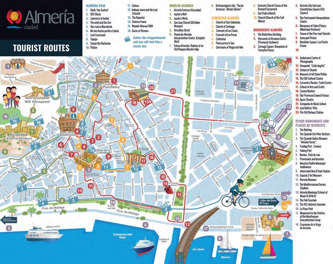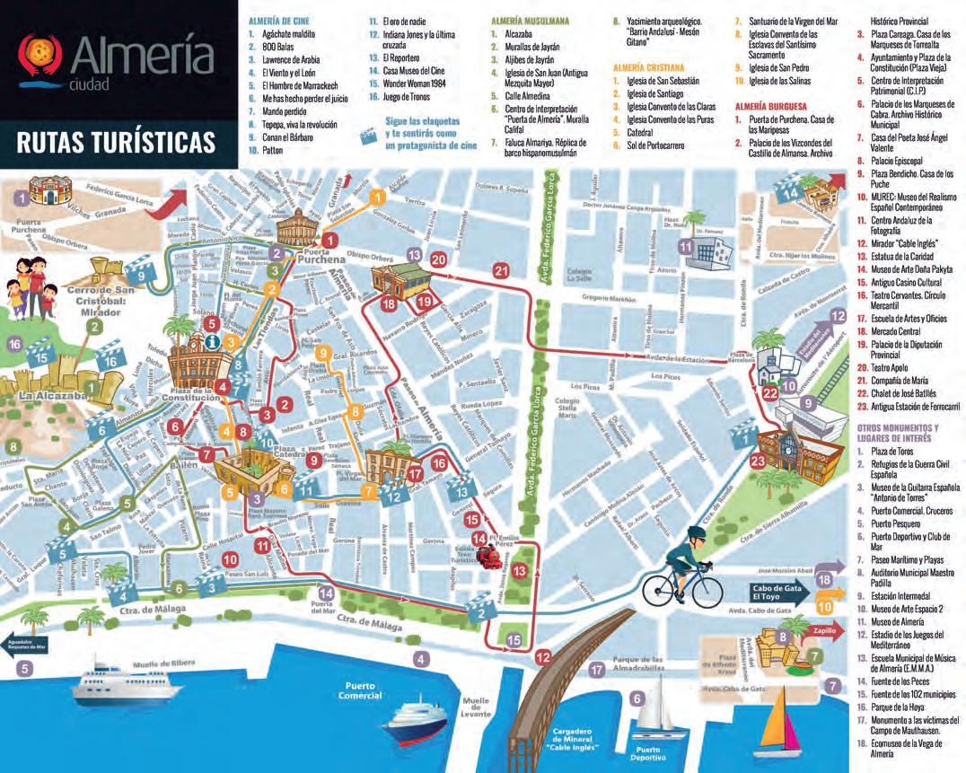 Así, dentro de la ciudad pueden disfrutarse de localizaciones de grandes producciones. Almería fue un lugar mágico en Conan el Bárbaro (Alcazaba de Almería-Cerro de San Cristóbal), representó «Messina» en Patton (Parque Nicolás Salmerón, finca de Santa Isabel y la Catedral), «Hatay» en Indiana Jones y la Última Cruzada (Escuela de Artes de Almería y La Medina), «El Cairo» en Lawrence de Arabia (Parque Nicolás Salmerón) y «Tán-