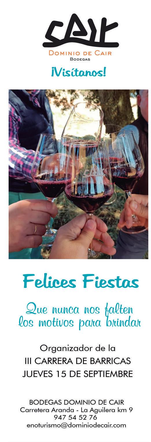 de Aranda ha querido que este año sea el vino el que anuncie las fi estas patronales. Un símbolo de nuestra tierra que la naturaleza nos da en forma de uva y los arandinos y ribereños recogen cada año para convertirla en un universo de experiencias: el vino comenzó hace cientos de años siendo solo vino y ha evolucionado para convertirse en cultura, tradición, música, desarrollo económico, enoturismo. El vino ha sido un compañero de viaje para todos nuestros antepasados y así seguirá siendo en los tiempos venideros, porque el vino de Ribera del Duero es eterno. Y no entiende de fronteras.