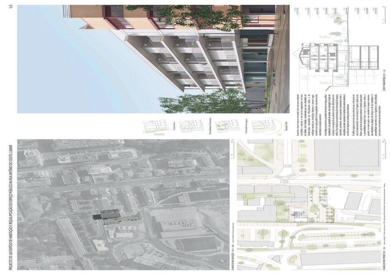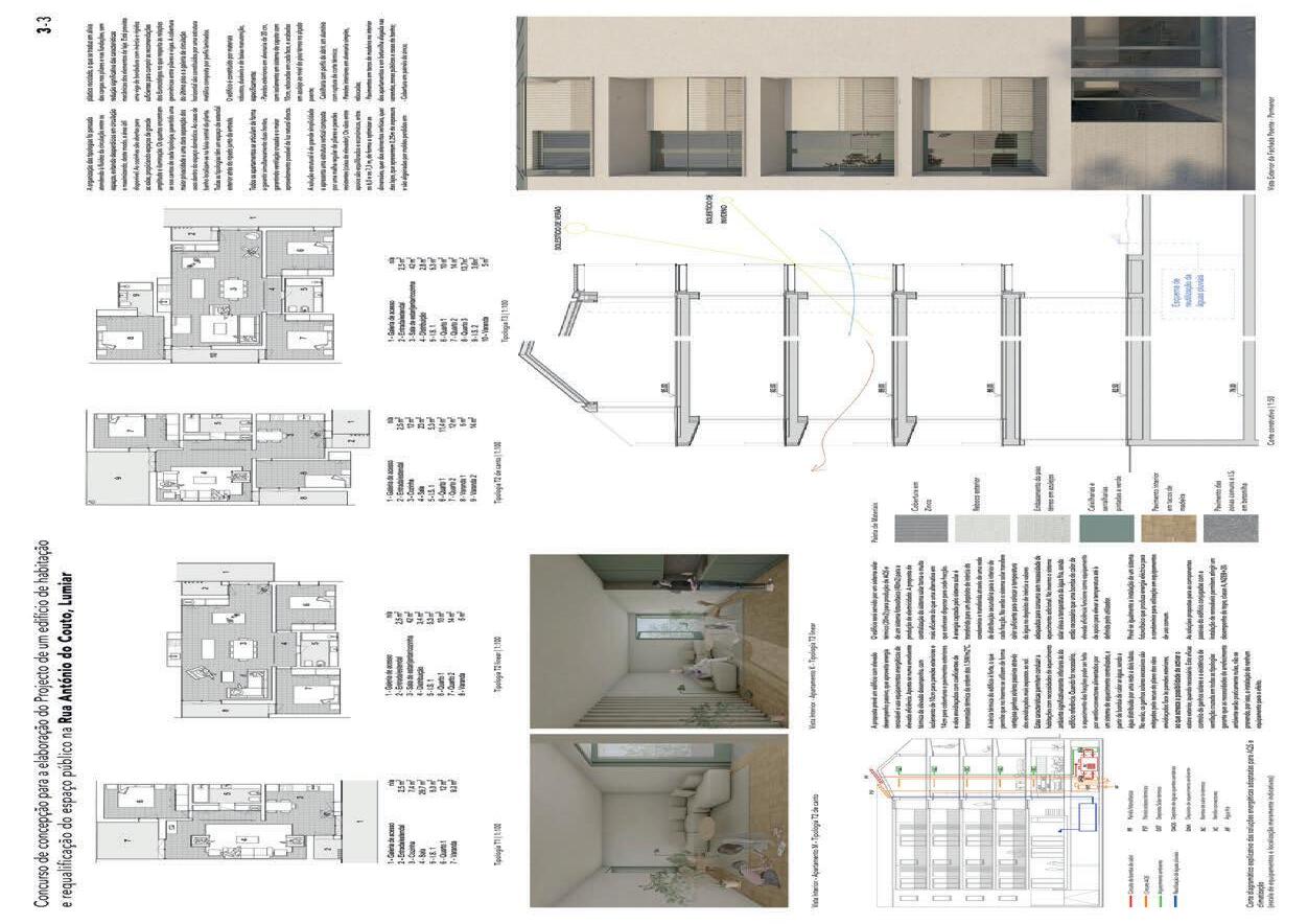 4º CLASS. (MENÇÃO HONROSA): A solução revela uma elevada preocupação na relação que estabelece com a envolvente construída. Destaca-se o modo como a nova construção se articula com a frente edificada através da repetição do volume do edifício a sul e o recuo do plano de fachada para integração das varandas, resultando numa relação harmoniosa com a envolvente.