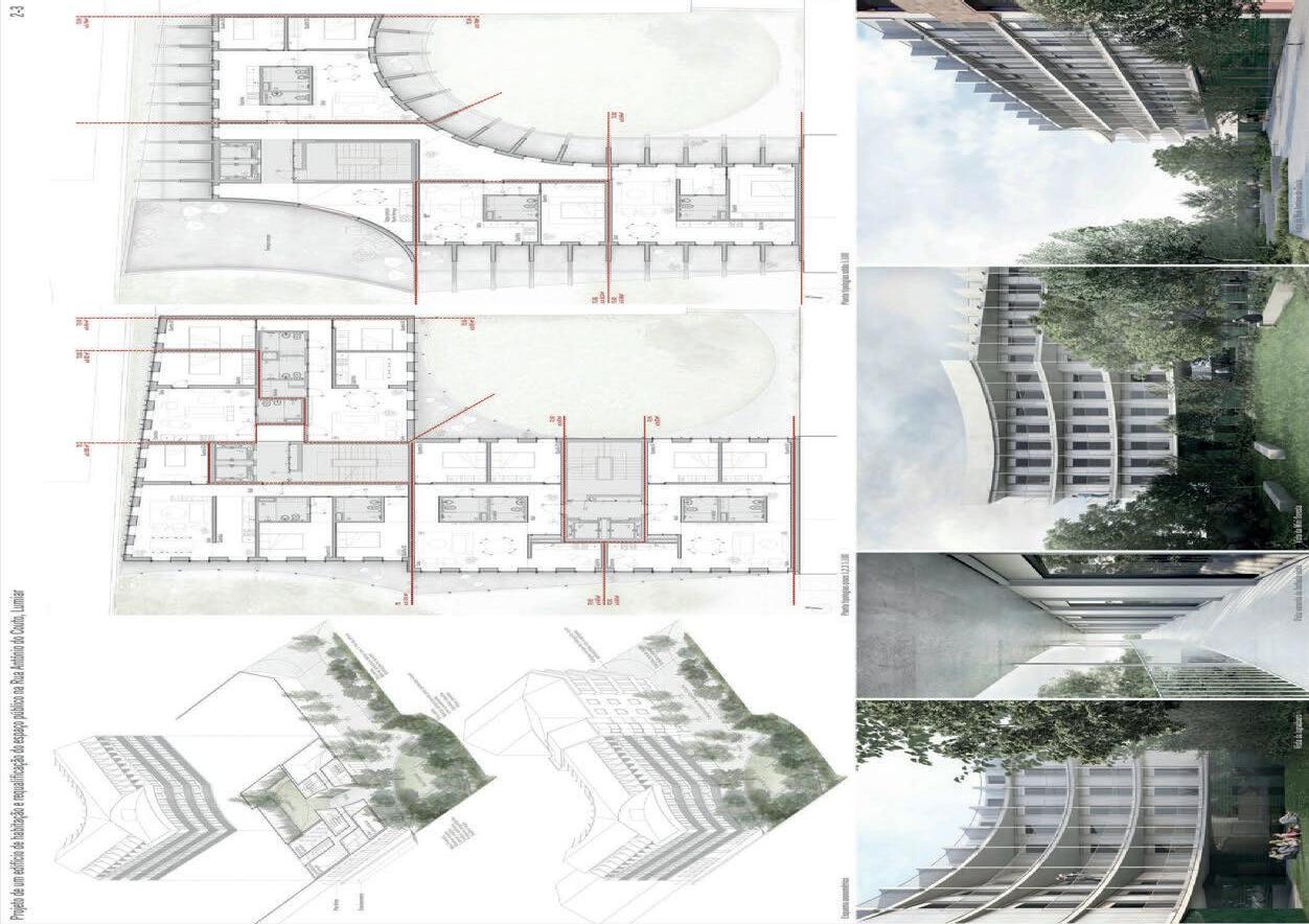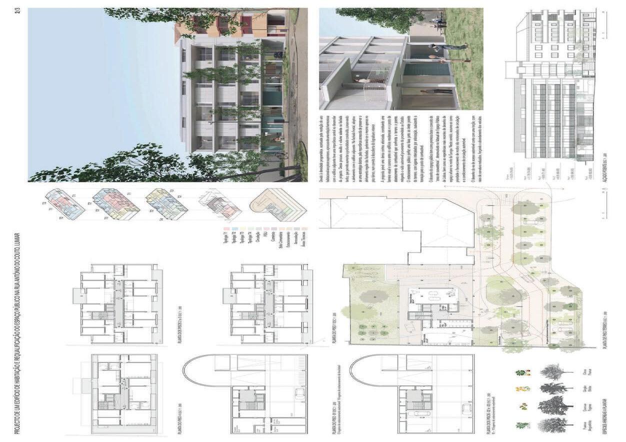 1º CLASSIFICADO: A proposta destaca-se pelo foco colocado no habitar coletivo e na requalificação do espaço público como contributo fundamental para a dinamização do Bairro. A solução estabelece uma forte relação com a envolvente e contribui para a imagem positiva do lugar, respeitando, ainda, os critérios fundamentais do programa preliminar.