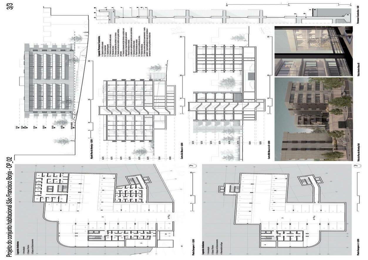 A solução arquitetónica para o novo conjunto residencial S. Francisco de Borja resulta de uma operação urbanística ponderada em função do sítio e do programa habitacional proposto, cujo gesto fundador consiste na definição de um novo logradouro público entre dois corpos alongados, de cinco pisos, que se ‘encostam’ aos limites poente e nascente do lote, e nos quais se distribui o programa habitacional previsto.