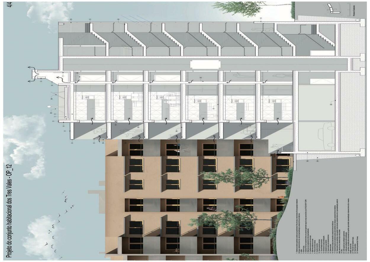 No que respeita ao desenho das fachadas, a solução apresentada para a Rua dos Três Vales e para a Rua de São Lourenço não é tão interessante como a que envolve o interior do quarteirão, onde são criadas varandas que permitem uma relação mais evidente entre o espaço exterior e o interior dosOedifícios.desenho das habitações, apesar de resultar numa boa organização dos fogos, não garante o completo cumprimento do programa no que respeita à distribuição das tipologias.