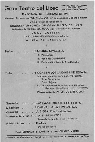 De Larrocha ya había debutado en el Gran Teatro del Liceo en diciembre de 1939 con un programa dedicado a Granados en el que interpretó algunas de las piezas de la suite para piano Goyescas y el Allegro de concierto , además del “Preludio” de los Cantos populares