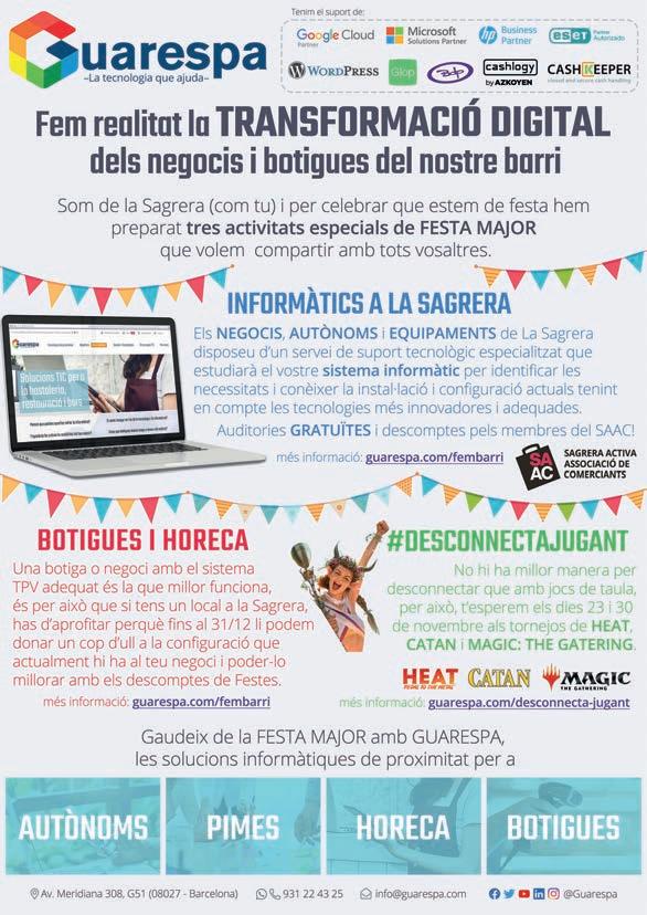 Espero veure-us a totes i a tots al pregó que donarà el toc d’inici i que enguany serà el dijous 14 de novembre al Centre Cívic de La Sagrera. Després ens veurem al Poliesportiu Camp del Ferro, on farem l’entrada a la Festa Major amb un sopar i un espectacle per celebrar com cal l’aniversari de la Comissió de Festes.