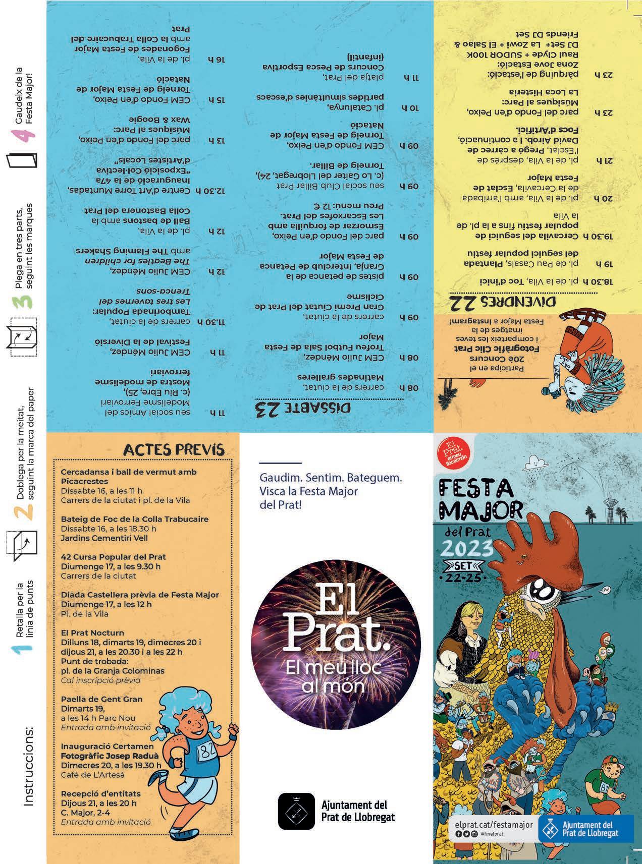 Septiembre en El Prat es sinónimo de Fiesta Mayor. Cuando los días se van haciendo más cortos y el curso acaba de empezar, los y las pratenses despedimos el verano y nos reencontramos en la ciudad con unos días de diversión y de celebración con la familia, los vecinos y las amistades: celebrando nuestra fiesta, xamosa i galana Desde el Toc d’inici, el viernes por la tarde, hasta el úlimo estallido de los fuegos artificiales el lunes por la noche, durante cuatro días disfrutaremos de una amplia oferta de actividades pensadas para todas las personas de la ciudad. Desde las actividades de cultura popular, como el Pratifoc o la Diada Castellera, hasta los conciertos, pasando por un buen número de espectáculos teatrales. Desde citas deportivas como la Cursa Popular hasta otras de tipo cultural como El Prat Nocturn. En espacios tradicionales como la plaça de la Vila, otros que ya hace mucho tiempo se han convertido en escenarios irrenunciables de la fiesta como el Fondo d’en Peixo o la Cirquera, y algunos que en los últimos años se han sumado a nuestra Fiesta Mayor, como la Zona Jove Estació, o el CEM Julio Méndez, podremos disfrutar de un amplio programa con un nexo común: la celebración de la cultura.