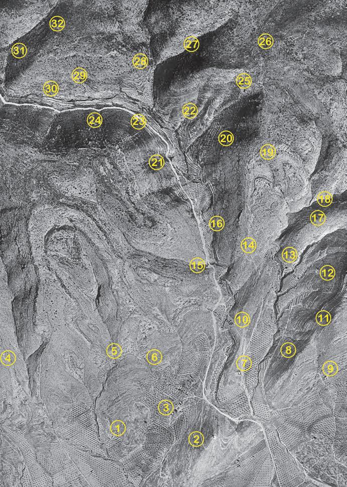 Madronyal. 9 Sant Lluis o, com se li anomenava abans: corral dels Mancos. 10 Corral del Tio Ginyao (també corral de Franco o corral de Nacher). 11 Senda del Blanquinal per l’ombria del cabesset de la Creu. 12 Pouet de Bellot. 13 Pou de la Neu i tot el sistema de bancals que l’envoltava. 14 Senda del Pontal. 15 Barranc del Perelló i bancals, hui abandonats, del fons del barranc. 16 Caseta del Sastre i bancals que l’envolten. 17 Lloma Llarga i senda del Madronyal. 18 Barranc del Madronyal. 19 Senda del Pontal i lloma dels Sumaorets. 20 Ombria de la lloma del Pontal i barranc del Racó de les Coves, on veiem tots els bancals de la foto 18. 21 Barranc del Perelló on està el Malpàs i el parat de la carretera a la foto 39. 22 Barranc del Racó de les Coves i els bancals de les fotos 23 i 24. 23 Cantal Redó 24 Racó del Carlista (hui l’anomenem ‘Racó dels