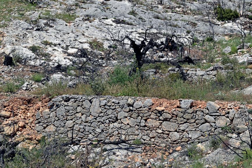 Foto 28: Sistema de parats de pedra seca en el barranc de l’Esquerre, al ponent de la lloma de les Cabres. Hi ha tot un entramat de marges de pedra molt ben realitzats on encara veiem les oliveres que no fa tant de temps van ser abandonades. També trobem una caseta ja arruïnada. Molts dels parats travessen perpendicularment el barranc i el remunten un bon tros camí dels alts de l’Atotxar. (Coordenades UTM 30 S 691758 4288255)