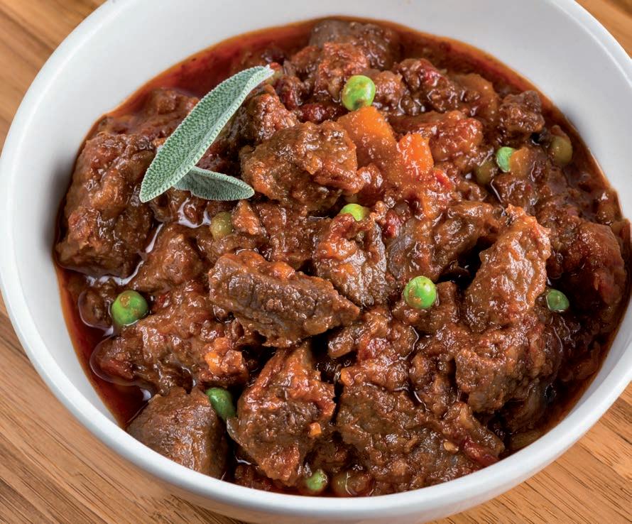Una tapa típica de Toledo, cuya carne guisada con tomate, guisantes, y un punto de picante, acompaña cualquier aperitivo toledano que se precie. En cazuela de barro, y acompañado de unas rebanas de pan.
