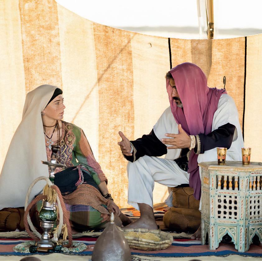 Composta por Sheik, pajem, guardas, músicos, bailarina, falcoeiro e ainda dromedários, burro e falcão. Pernoitam em tenda “original” feita em pelo de dromedário e cabra, decorada tradicionalmente, permitindo a sua utilização na vertente social, artes e lazer, cozinha e higiene.