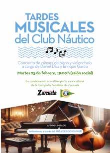 Las ‘Tardes musicales del Club Náutico Sevilla’ inauguraron el calendario 2025 el martes 25 de febrero con un concierto de cámara de piano y violonchelo a cargo de Daniel Díaz y Quique Santamaría. El evento musical, celebrado en el salón social, que completó su aforo previa reserva, se celebró con la colaboración del Proyecto sociocultural de la Compañía Sevillana de Zarzuela.