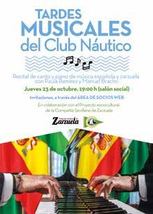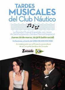 Las ‘Tardes musicales del Club Náutico’ celebraron su segundo acto del año el jueves 20 de marzo, en esta ocasión con la Revista Musical Española como protagonista con Jesús de Sancha al piano y la soprano Soraya Méncid, organizado con la colaboración del Proyecto sociocultural de la Compañía Sevillana de Zarzuela.