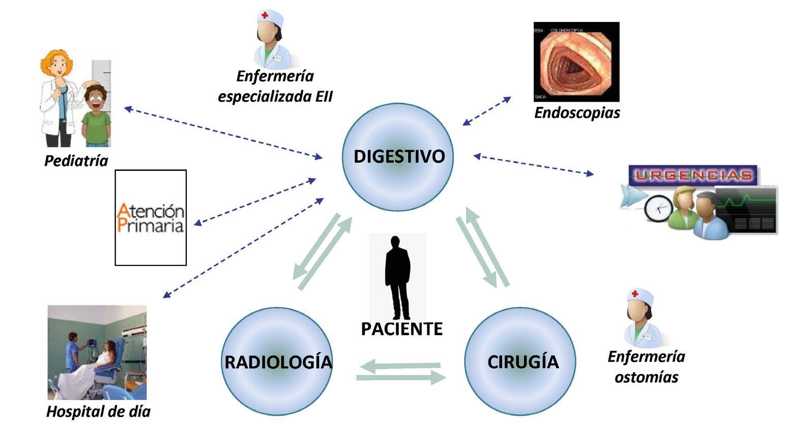 Existe coordinación con otros Servicios para brindar a nuestros pacientes una atención multidisciplinar, disponiendo de un equipo quirúrgico de referencia con experiencia en el tratamiento quirúrgico de la EII y un radiólogo con experiencia en el diagnóstico por imagen de la EII. Realizamos una reunión mensual del comité médico quirúrgico en la que participan digestólogos, cirujanos, radiólogos y patólogos, permitiendo decisiones de manejo conjuntas y una asistencia más fluida.