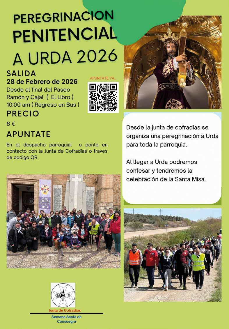 10 h. PEREGRINACIÓN a la Basílica del Stmo Cristo de Urda desde la explanada al final del Paseo Ramón y Cajal. Este caminar penitencial se hace extensivo a todos los feligreses de nuestra parroquia y en especial a todos los hermanos cofrades y quien participe en el ofrecerá un donativo de 6 euros.