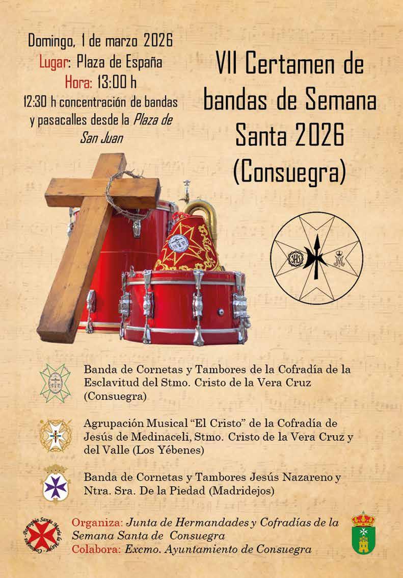 Participan en esta edición, la Banda de la Cofradía Esclavitud del Stmo Cristo de la Vera Cruz de Consuegra, Agrupación musical “el Cristo”de la cofradía de Jesús de Medinaceli, Cristo de la Vera de la Vera Cruz y del Valle (Los Yébenes) y Banda de Cornetas y Tambores Jesús Nazareno y Ntra. Sra. De la Piedad (Madridejos).