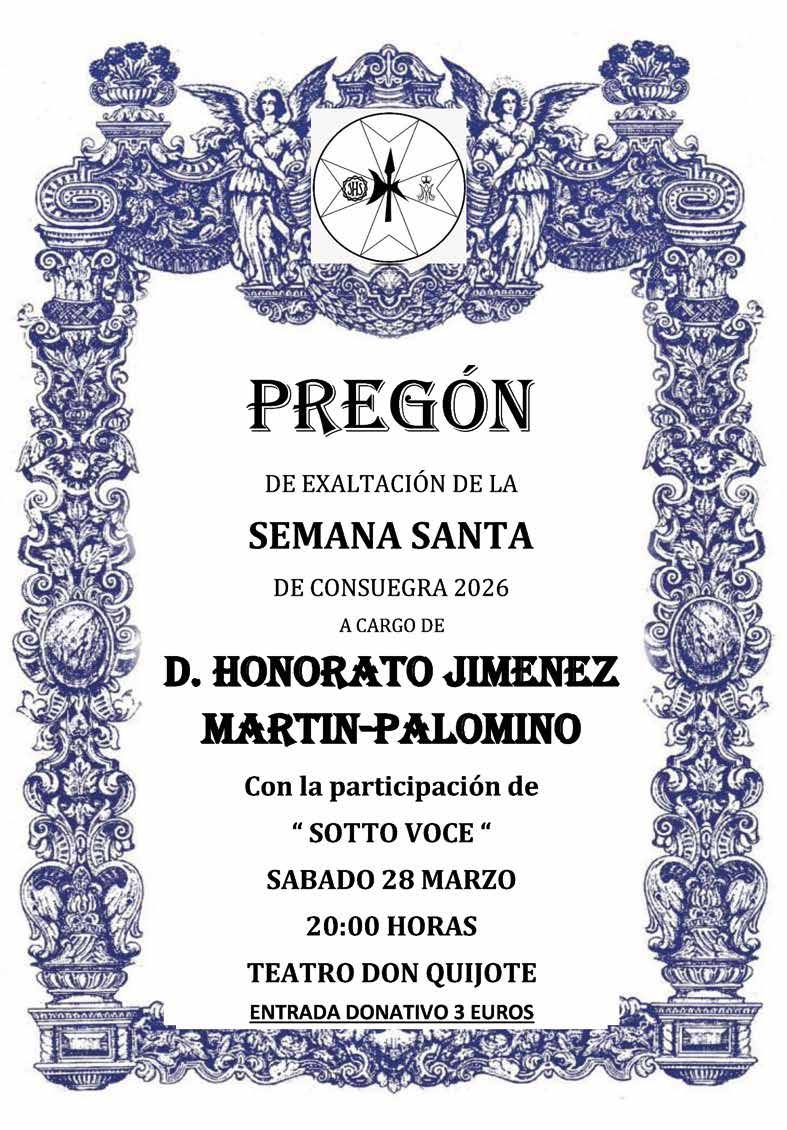 Deseo agradecer de corazón a todos los que hacen posible esta Semana Santa. Gracias por vuestra entrega generosa y desinteresada. Vuestro trabajo no solo engrandece a Consuegra, sino que es un testimonio vivo de fe. Gracias también a los Jóvenes Cofrades porque vuestra ilusión es la garantía de que el legado que recibimos de nuestros mayores seguirá vivo en las generaciones venideras.