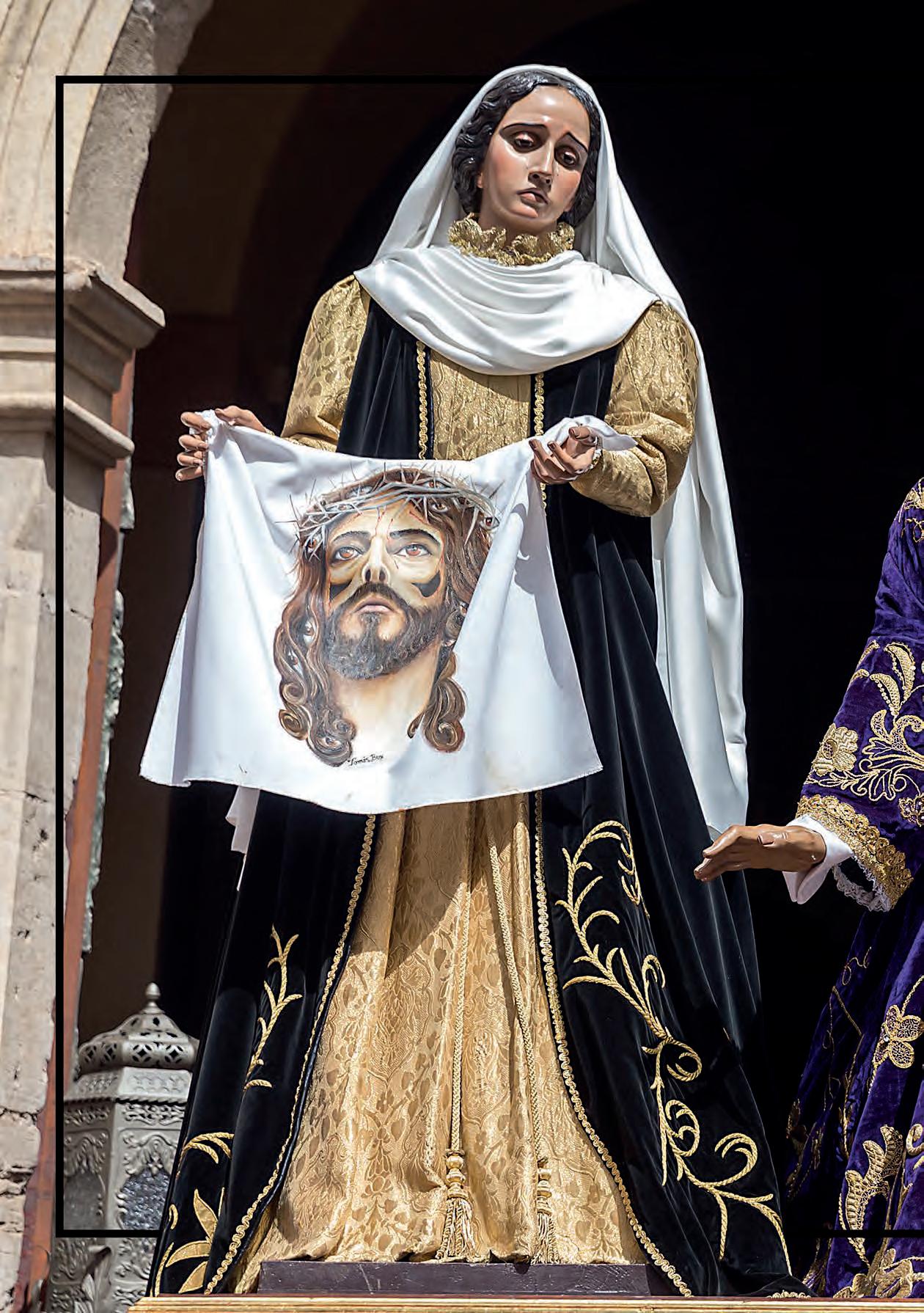 En concreto, la talla de la Verónica conforma el grupo escultórico de “La Caída/Nuestro Padre Jesús y la Verónica” 1945-1946. De madera policromada a tamaño natural.