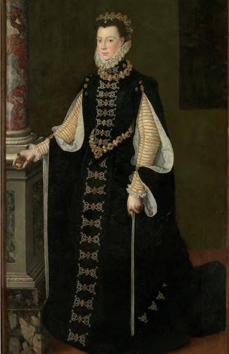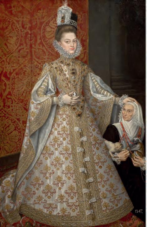 Unas mangas acuchilladas desmontables en el mismo terciopelo con amplia bocamanga culminan todo el ropaje exterior. Para el interior se ha confeccionado una enagua blanca en brocado de seda. Tejido empleado también como forro y vistas para el resto de las piezas que ha sido adquirido en la prestigiosa sastrería Gammarelli de Roma fundada en 1798. Para mayor detalle y realce se ha integrado al conjunto pasamanería de plata de origen francés e italiano del siglo XIX. Por último, como colofón al conjunto, estrenará un velo de plata, de origen egipcio, de Assuit de los años 20/40 del pasado siglo.