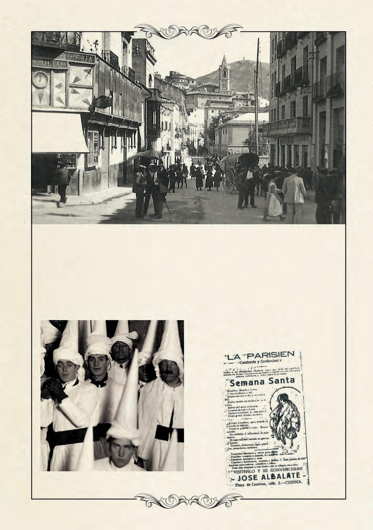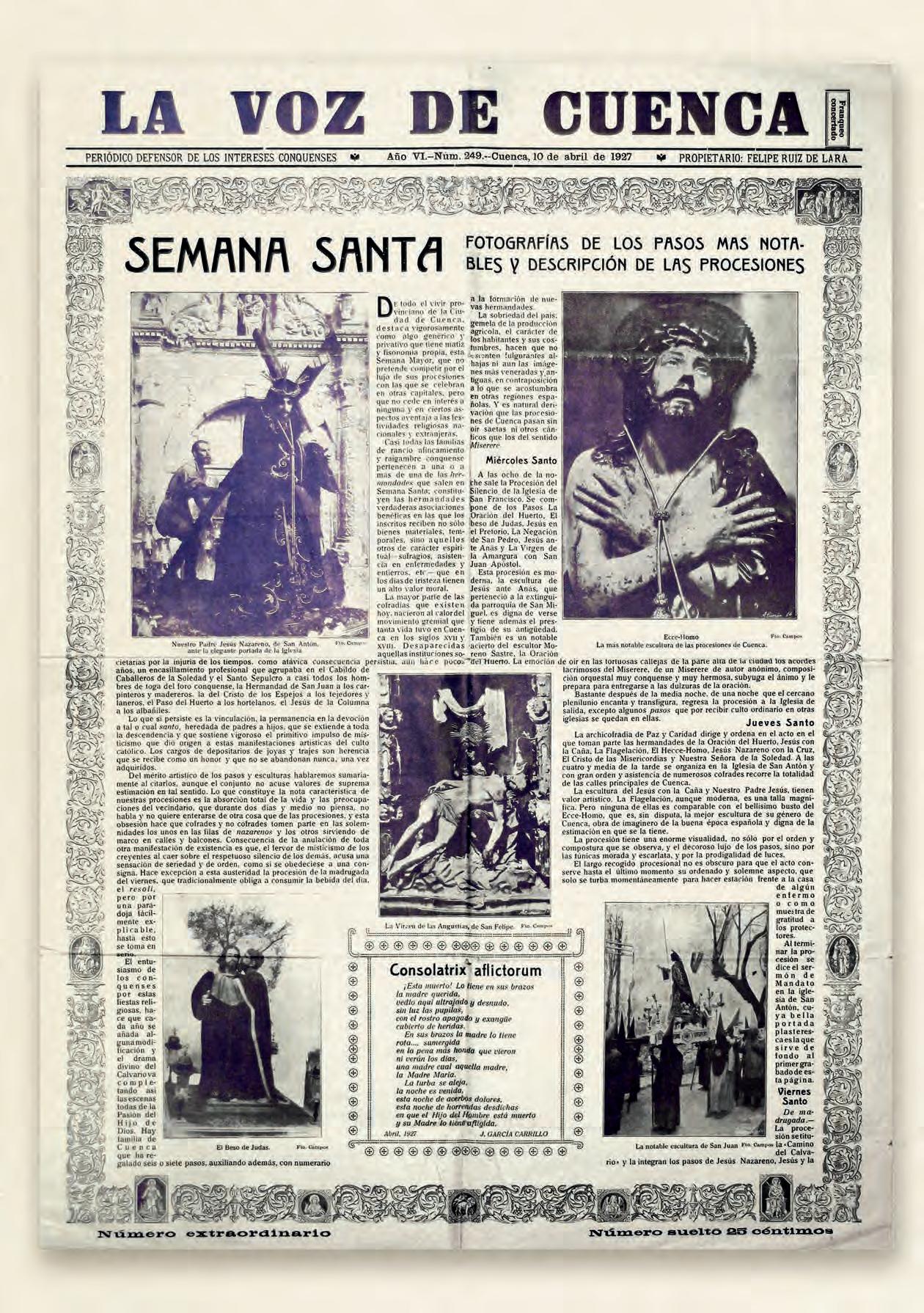 A continuación, volveremos de lleno a la Semana Santa de 1927. Aquel año la Cámara de Comercio reeditó su lujoso programa de 1926, esta vez ampliado con ocho páginas comerciales. Más difundido, creativo y especial fue el editado por La Voz de Cuenca en formato de gran periódico con fotografías del gran Rafael Campos y textos de Inocente García. Incluir en las páginas que siguen dos reproducciones reducidas de aquel especial parecía necesario.