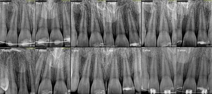 Los controles clínicos y radiográficos se realizaron a las 3 semanas (retirada de férula), 3 meses, 7 meses, 1 año y 2 años (Figuras 4z y 5). En todos los controles, los dientes mostraron respuesta normal a la prueba de sensibilidad al frío, sin molestias a la palpación ni a la percusión, y sin signos patológicos radiográficos.