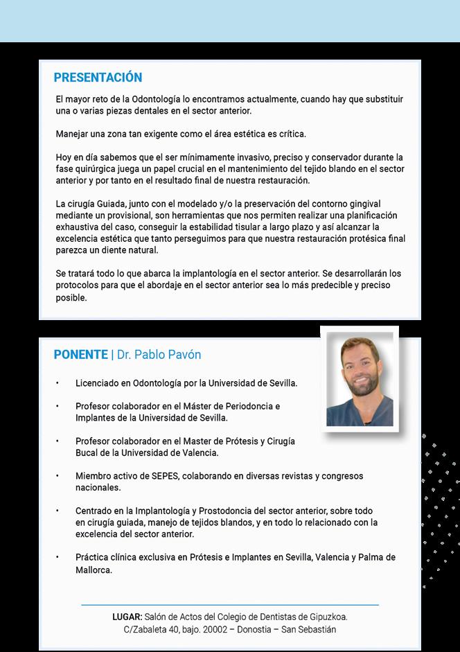 Cirujano Periodoncista con Master y más de 5 años de experiencia en tratamientos complejos con implantes (elevaciones de seno, regeneraciones óseas, cirugía mucogingival, cordales, fenestraciones,…) se ofrece para colaborar en País Vasco y alrededores. Material propio. CV disponible en el Colegio DREF20251105-01. Contacto por correo electrónico: periomucoimplantes@ gmail.com