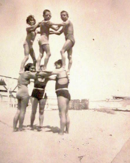 Probablemente en Castelldefels no haya imágenes ‘castelleres’ y ‘gimnásticas’ más antiguas que las que nos muestran estas simpáticas imágenes de una familia o grupo amplio de amigos y amigas, con sus hijos e hijas, en la playa de Castelldefels. Parece como si estuvieran alojados en una de las casetas que algún establecimiento, como “Baños de Castelldefels” por ejemplo, tenía sobre la arena para uso de la gente que venía a disfrutar de su día (o días) de ocio.