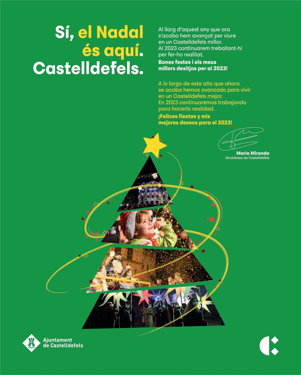 Encaramos el último mes del año y Castelldefels engalana sus calles (con las tradicionales luces de Navidad) y sus comercios, que inician la campaña más importante del año a nivel de facturación y de la que depende, en muchos casos, su supervivencia futura. Nuestros comercios ofrecen productos de calidad y un servicio personalizado y cercano. Tengámoslo en cuenta a la hora de decidir nuestras compras. Desde el Ayuntamiento y con los gremios de Comercio y de Hostelería, con el objetivo de animar a vecinos, vecinas y visitantes a pasear por nuestras calles comerciales, ponemos en marcha diferentes iniciativas como son las luces de Navidad, actividades de dinamización (pequeños conciertos en la calle, talleres, ofertas y promociones especiales…). Y este año, una gran novedad, un Bosque Encantado en el Castillo, donde se podrá vivir una experiencia diferente en un entorno muy especial.