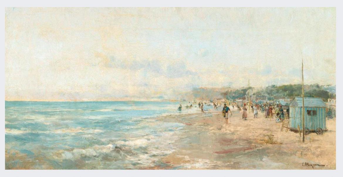 Eliseu Meifrèn (1858-1940) va pintar aquest quadre de la platja de Castelldefels a finals del segle XIX. És la imatge més antiga de la platja de la nostra ciutat i sorprenentment ja es veu plena de gent, amb uns vestidors amb rodes prop de l’aigua perquè es canviessin els banyistes.